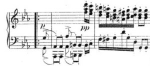 Inbar氏の演奏ですが、大変バランスの良い演奏に感じます。早すぎず、遅すぎずなテンポでややもすれば冗長になりがちな曲をうまーく型にはめ込むことに成功しています。そして、ベヒシュタインを使うだけあって音の分離感が素晴らしいですね。下記譜例の展開系の連続なんて、実にそれぞれの和音のキャラクターがはっきりと表れ(もちろん演奏者の解釈もあるかとは思いますが)ベヒシュタインの良さが生きているように思います。