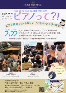 東京駅をはじめ、丸の内、八重洲、日比谷エリアの各所でピアノが弾けるイベント「東京ストリートピアノフェスティバル」が開催されます。 このフェスティバルの連動イベントとして、ベヒシュタイン・セントラム東京ショールームで実施するイベントです。未就学児から大人の方まで、どなたでも気軽にご参加いただけます。
