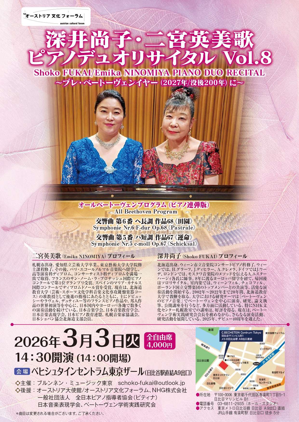 来年2027年は、ベートーヴェン没後200年となり、その記念プレコンサートとして、今回は、ベートーヴェンの交響曲第5番「運命」、第6番「田園」をピアノ連弾でお届けします。この交響曲の初演では、「田園」が第5番、「運命」が第6番となっており、この順で演奏されたことから、私たちも、「田園」から演奏します。同時期に作曲されたとは思えない、まったく異なった雰囲気を持つこの2つの交響曲をピアノデュオでどうぞごゆっくりご堪能ください。
