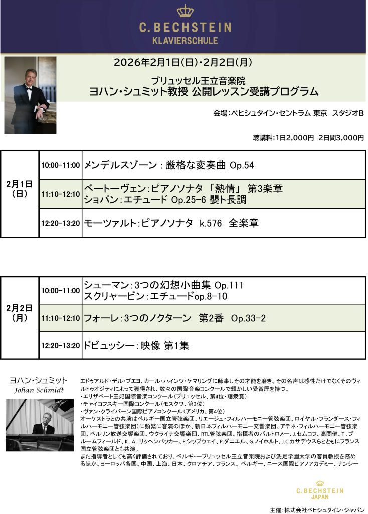 ベルギーにある名門音楽学校、ブリュッセル王立音楽院の教授であり、数々の国際音楽コンクールで輝かしい受賞歴を持つピアニストであるヨハン・シュミット教授のレッスンを開催いたします。