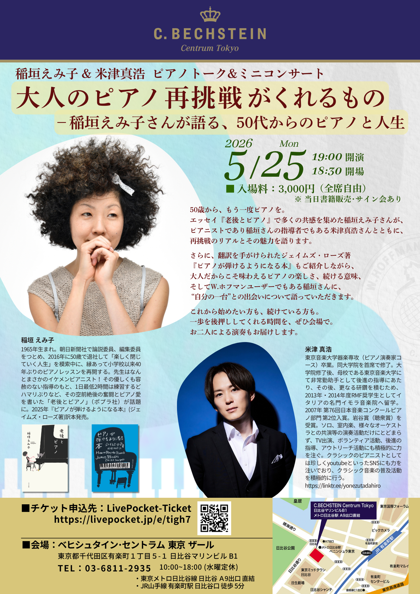 W.ホフマン グランドピアノのユーザーであり、エッセイ『老後とピアノ』で多くの共感を集めた稲垣えみ子さんが、ピアニストであり稲垣さんの指導者でもある米津真浩さんとともに、再挑戦のリアルとその魅力を語ります。