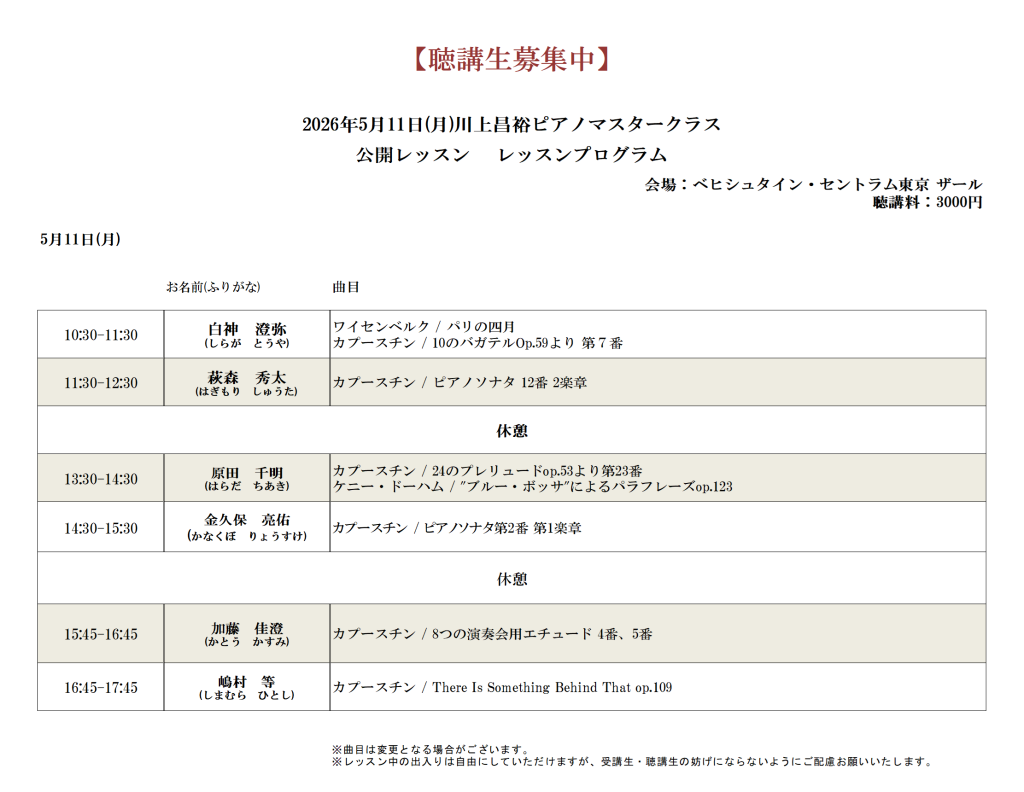 日本を代表するピアニスト・教育者であり、カプースチン研究のスペシャリストである川上昌裕氏を講師に迎え、音楽の本質に迫るピアノマスタークラスを開催いたします。