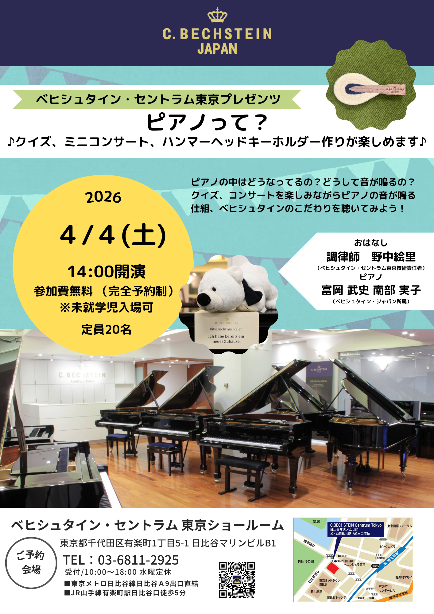 ピアノの中はどうなってるの?どうして音が鳴るの?クイズ、コンサートを楽しみながらピアノの音が鳴る仕組、ベヒシュタインのこだわりを聴いてみよう!クイズ、ミニコンサート、ハンマーヘッドキーホルダー作りが楽しめます♪