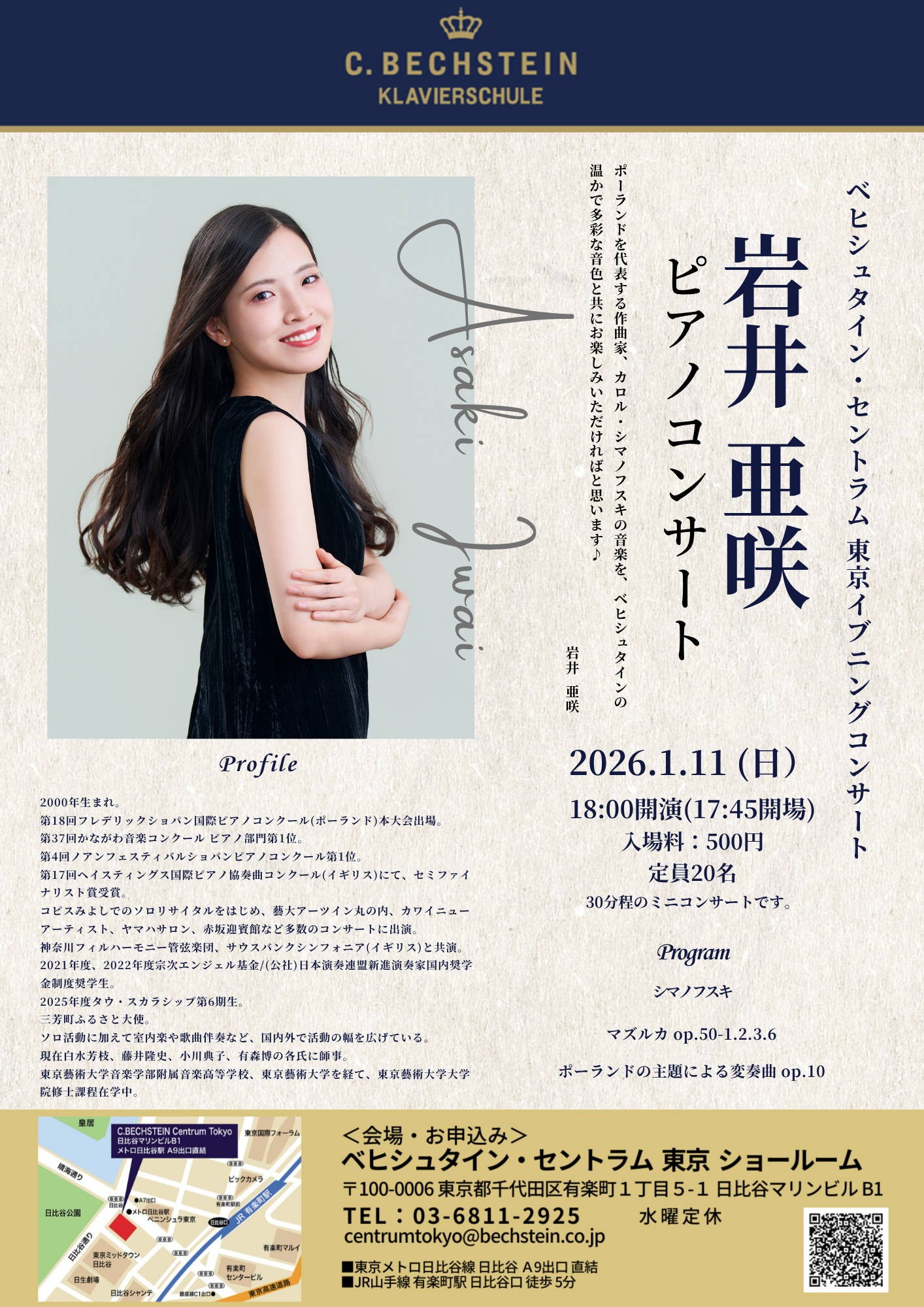 ポーランドを代表する作曲家、カロル・シマノフスキの音楽を、ベヒシュタインの温かで多彩な音色と共にお楽しみいただければと思います♪岩井 亜咲