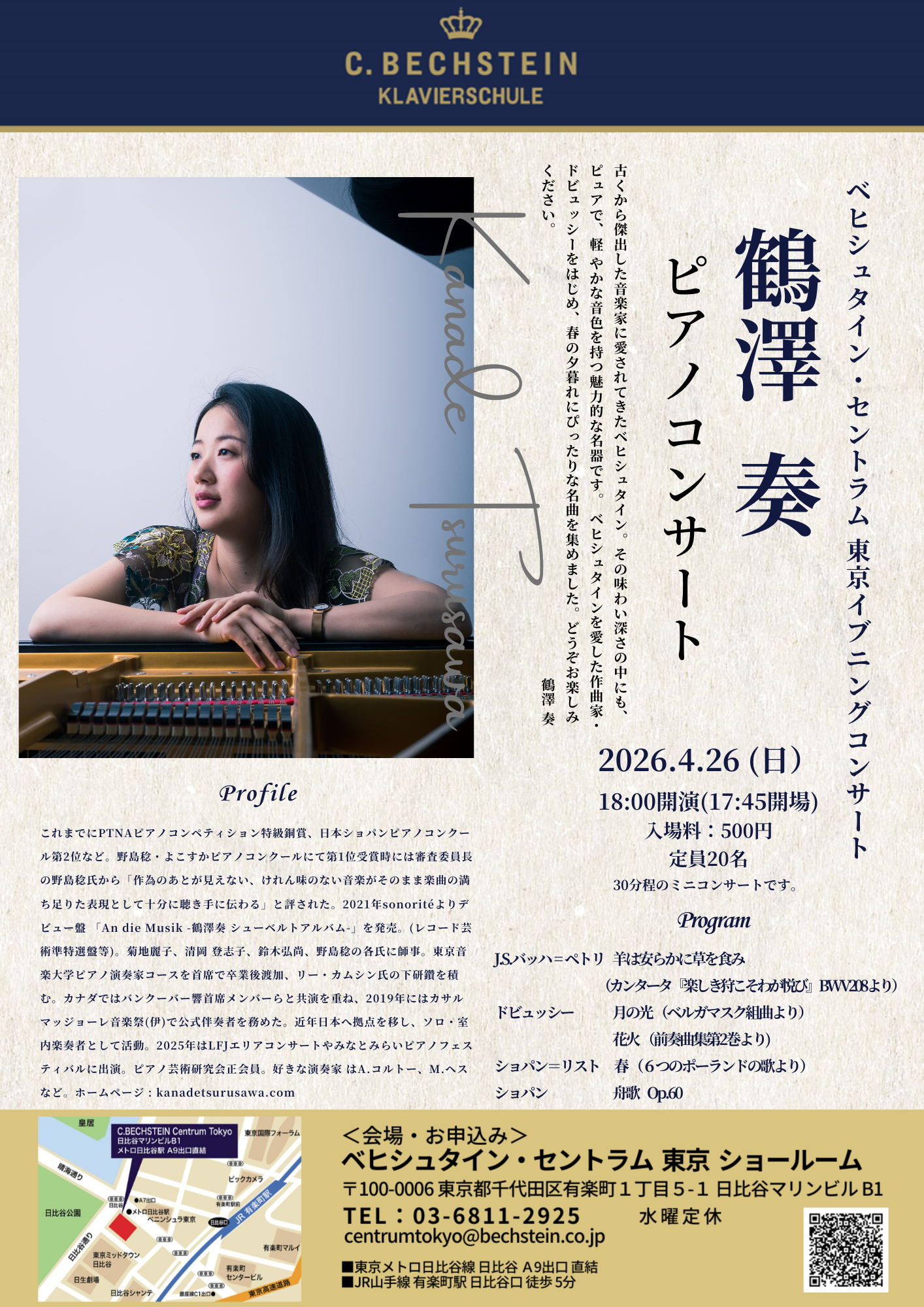 ベヒシュタイン・セントラム東京ショールームで開催するミニコンサート。今回は、ピアニストの鶴澤 奏さんをお招き致します。