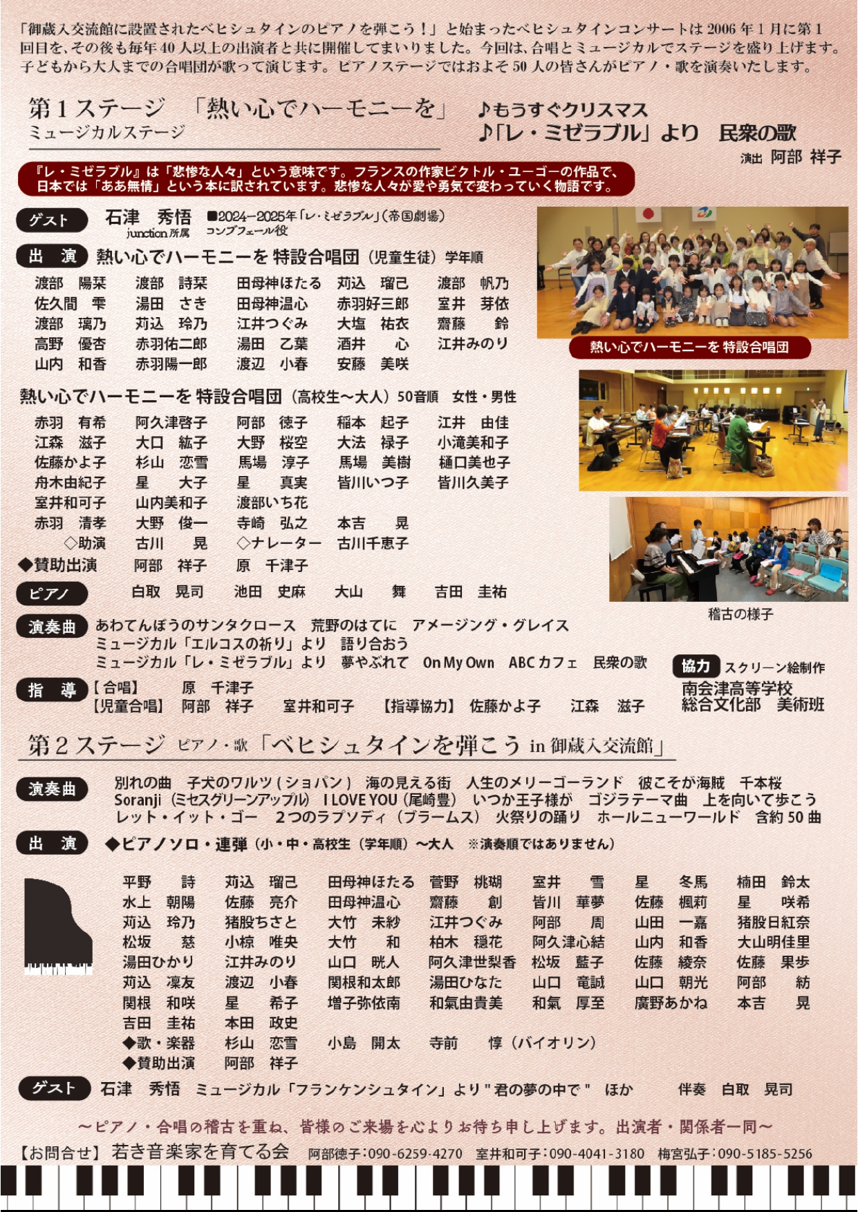 「ここ御蔵入交流館文化ホールには世界三大ピアノの一つといわれるベヒシュタインのピアノが設置されています。子ども達に「このピアノに触れてほしい、演奏家の演奏を聴いて欲しい」という思いからこのコンサートの企画が始まりました。南会津町教育委員会様協力のもと、2006年1月に第1回を開催し、その後も毎年およそ50人の出演者と共にコンサートを開催してまいりました。今年も出演者は皆様に素敵な音色を届けようと何か月も練習してきました。「音楽は世界の共通語、人と人をつなぐ」と言われるとおり、会場の皆様と演奏者がつながり、幸せな気持ちになることを願い演奏いたします。