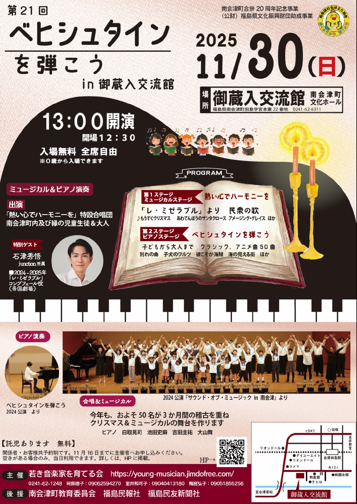 入場は無料、0歳児からも入場できるとのこと。お近くにお住まいの方、このタイミングで南会津方面へお出かけになるチャンスのある方、ぜひお立ち寄りいただいて「若き音楽家」たちの熱演とベヒシュタインの響きを鑑賞してみてはいかがでしょうか。