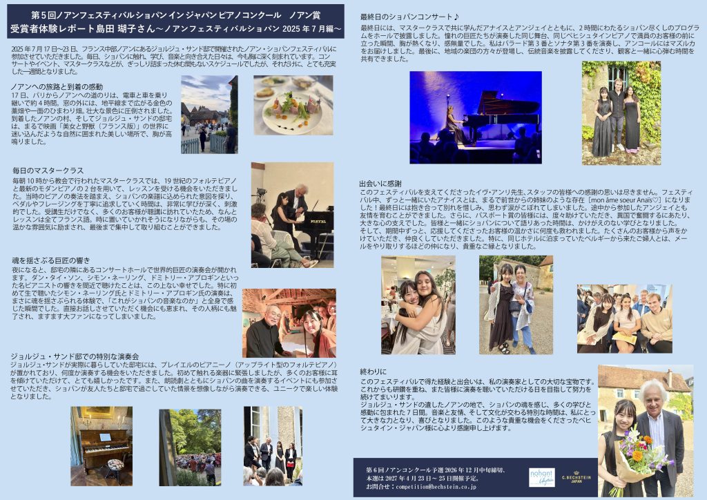 第5回ノアンコンクール本選にてノアン賞を受賞された島田瑚子さん(A2部門第1位)よりノアンフェスティバル2025のレポートが届きました!