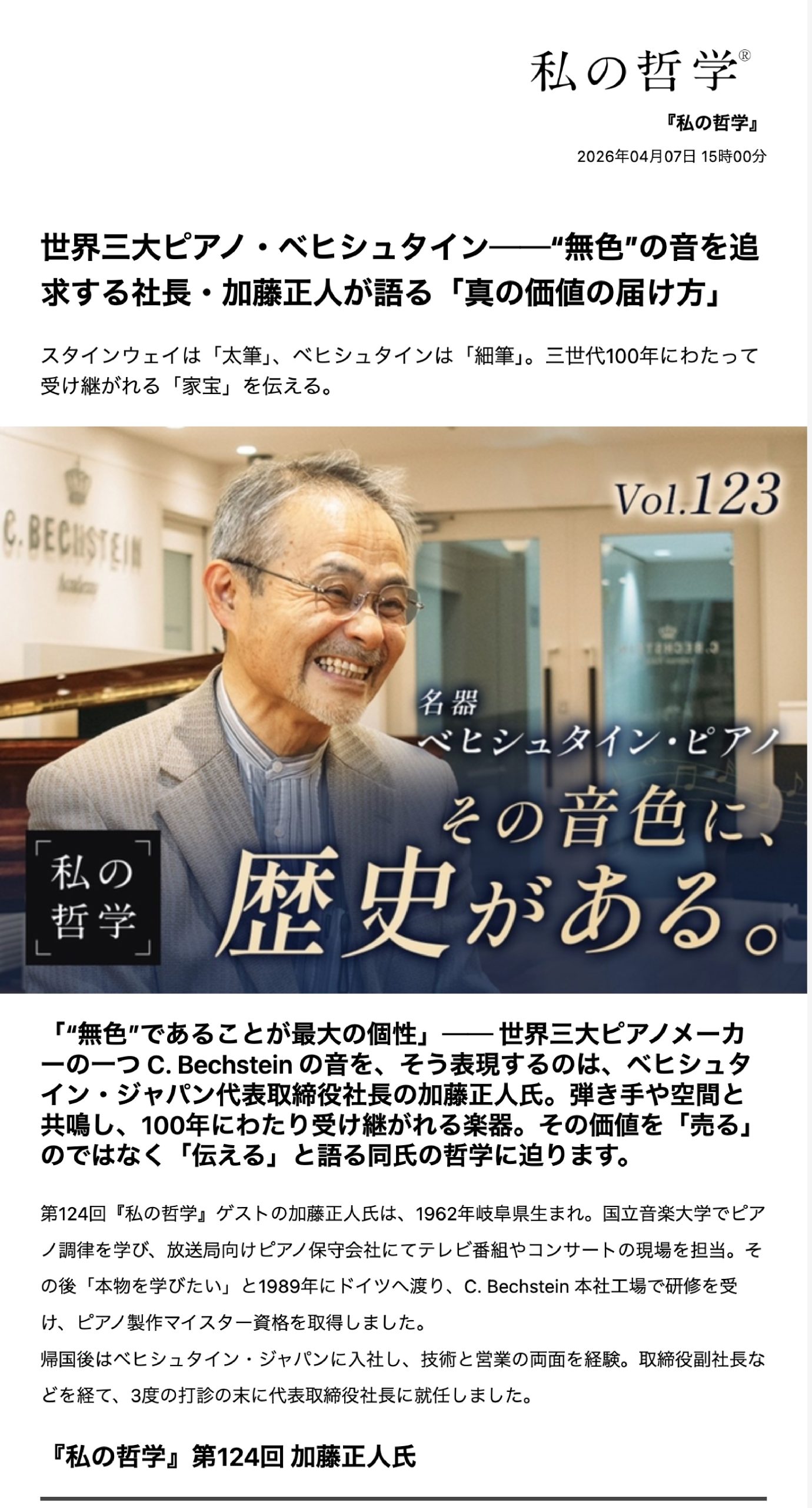 このたび、各界で活躍する著名人の価値観や人生観に迫るインタビューシリーズ『私の哲学』第124回に、株式会社ベヒシュタイン・ジャパン代表取締役社長・加藤正人が登場いたしました。本シリーズは、経営者や文化人、アーティストなど第一線で活躍する多彩な人物が出演するウェブメディアとして注目を集めています。